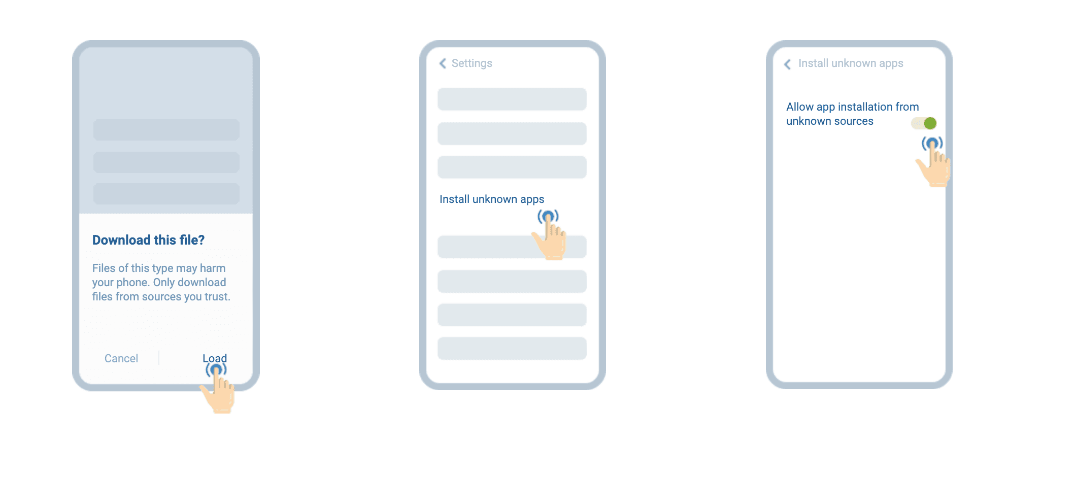 - Tuntemattomat lähteet: Varmista, että olet ottanut käyttöön Tuntemattomat lähteet -vaihtoehdon laitteesi asetuksista. Ilman sitä Android ei salli sovellusten asentamista muista lähteistä kuin Google Play Kaupasta.